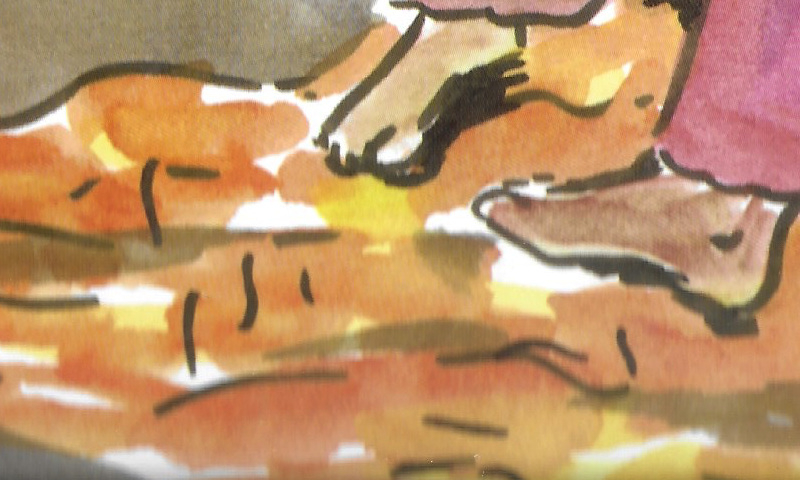 Raju puts his foot on the coals. A sharp pain shoots through him and it smells burnt. He sees the missionary and his wife rushing to help him, then he collapses, unconscious from the pain.